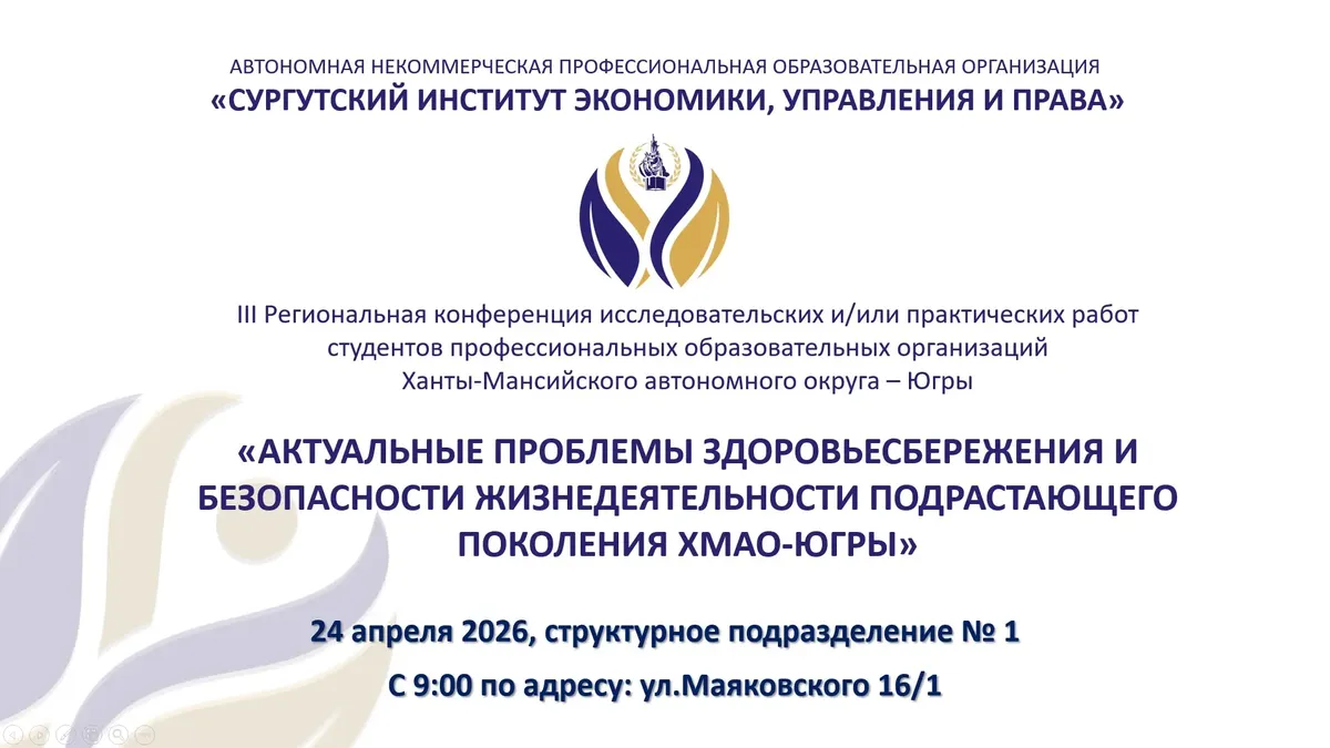 24 апреля 2026 года на базе структурного подразделения № 1 по адресу: ул. Маяковского, д.16 состоится III Региональная конференция исследовательских и практических работ студентов профессиональных образовательных организаций Ханты-Мансийского автономного округа - Югры на тему: "Актуальные проблемы здоровьесбережения и безопасности жизнедеятельности подрастающего поколения Ханты-Мансийского автономного округа Югры".